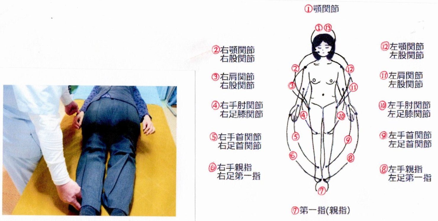 ■操法:左手中指を受け手の右手首関節へ、右手中指を足首関節に、その姿勢で氣を意識する(氣ワーク・良くなってね・楽になってねと呟く)。